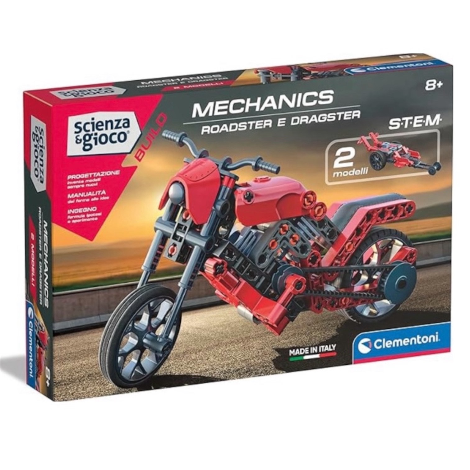 LABORATORIO ROADSTER E DRAGSTER, un set di costruzioni che permette ai bambini di esplorare i principi della meccanica costruendo modellini di auto da corsa, stimolando la loro creatività, logica e abilità manuali in modo divertente e coinvolgente. Questo kit include oltre 130 componenti per costruire un roadster e un dragster.